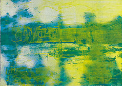 Die Farbradierung des Wiener Künstlers Christoph Urwalek basiert auf einem Foto, aufgenommen aus dem fahrenden Auto. Die Thematik der Bewegung, von Geschwindigkeit und der dadurch bedingten Transformation des Gesehenen realisiert der Künstler in einer Radierung. Dies führt zu einer Abstraktion, die die Koordinaten der Landschaft beibehält. Ein Horizont bleibt erkennbar, konstituiert durch eine differenzierte Farbigkeit, aufgebaut in drei Druckvorgängen.